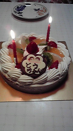 「キテミテキタク」というイベントのボランティアスタッフ。 ライブステージの担当をしながら、給排水設備まで管理。 走り回りながらのスタッフ活動も、時々はビールをグビッ!^^ 中高年大学の学生さん^^;;5名とともに、 ライブステージを運営させていただきました。 珍しく息子家族や娘までが競馬場まで来てもらって、 父のヘロヘロ状態を直接観察してもらった^^;;; ヘロヘロ状態のまま帰宅しても、孫二人にいじられて 疲れも癒されるようだったが、入浴時に孫2号が乱入! お陰様で初めて孫2号に泣かれないで入浴できました。 部屋に戻ってイスに腰掛けながら、知らないうちに 眠ってしまった心地良い一日でありましたとさ^^ 残すところあと11年・・・・と考えると、 ますます、充実した人生を望むところぢゃ。 「とうちゃん」というネーム入のケーキなんて 初めてじゃないのか?と言うことで、 久々更新のついでに、写真もアップ!^^ ろうそく2本って^^;; 1本は50歳、1本は7歳ということで理解。 美味しくいただきました。 幼少の頃は天使だった娘だが・・・ 最近では、食べ物の小競り合いから、 朝の洗面所の場所取り争いなどで、 父を威嚇するようになり、 可愛い悪魔に成り下がった娘です。 パートナーからは、 長年連れ添った「スリッパ」に見切りを付け るように、新しい「スリッパ」を戴きました。 さあてと、今月はイベント有り。一周忌の法事有り。 法事の慰労会やら、サッカー観戦やら・・・・忙しいけど 体調にだけは気を付けま~す!^^